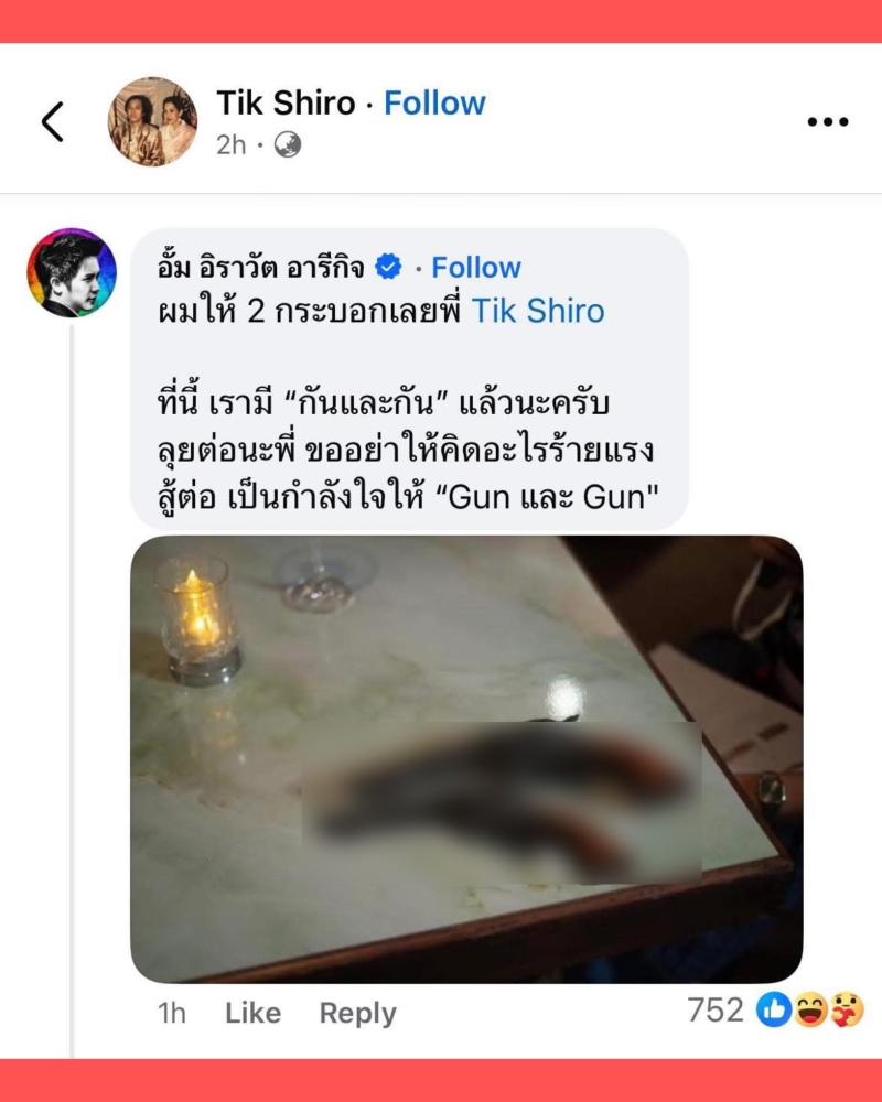 จากกรณีประเด็นของ ติ๊ก ชิโร่ ได้ออกมาโพสต์ภาพปืน ท่ามกลางแฟนๆและคนในวงการต่างส่งกำลังใจให้ โดยทางด้าน หมออั้ม อิราวัต อารีกิจ ก็ได้มีการเข้ามาคอมเมนต์ของ ติ๊ก ชิโร่ โดยคอมเมนต์ตัดภาพปืนอีกกระบอกวางบนโต๊ะ พร้อมข้อความบอกว่า ผมให้ 2 กระบอกเลยพี่ ที่นี้ เรามี กันและกัน แล้วนะครับ ลุยต่อนะพี่ ขออย่าให้คิดอะไรร้ายแรง สู้ต่อ เป็นกำลังใจให้ Gun และ Gun