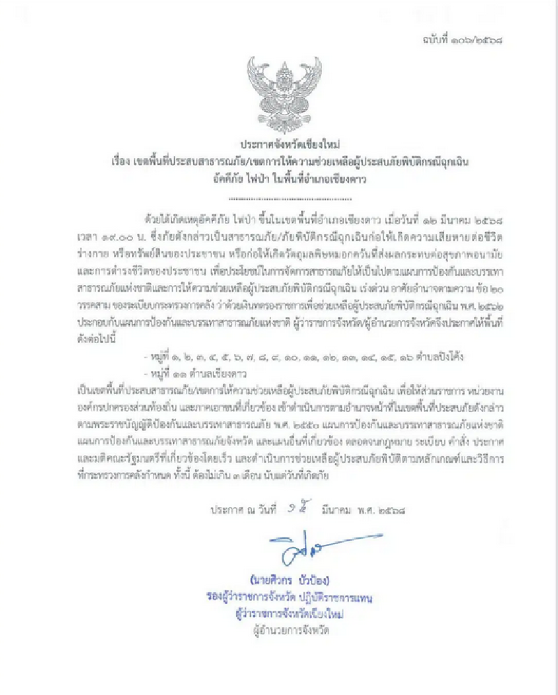ล่าสุดวันนี้ (24 มีนาคม 2568) จังหวัดเชียงใหม่ ได้เผยแพร่ประกาศฉบับใหม่ ว่าด้วยเรื่อง เขตพื้นที่ประสบสาธารณภัย/เขตการให้ความช่วยเหลือผู้ประสบภัยพิบัติกรณีฉุกเฉิน อัคคีภัย ไฟป่า รวม 5 ตำบล ใน 2 อำเภอ ได้แก่ อำเภอเชียงดาว และ อำเภออมก๋อย พร้อมสั่งการเร่งให้ความช่วยเหลือ