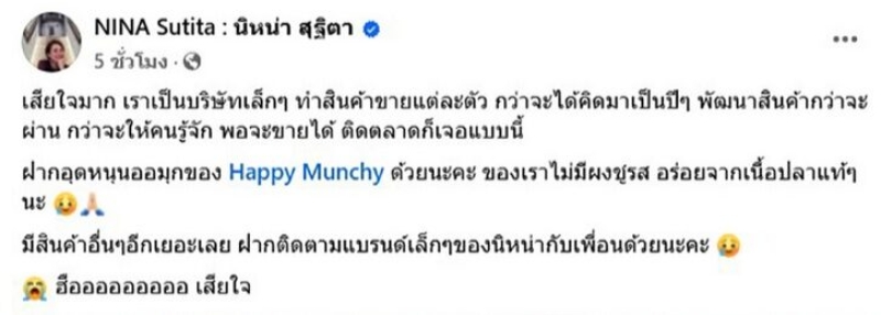 โดย นิหน่า ได้โพสต์ตัดพ้อผ่านทางเฟซบุ๊ค NINA Sutita : นิหน่า สุฐิตา ระบุว่า เสียใจมาก เราเป็นบริษัทเล็กๆ ทำสินค้าขายแต่ละตัว กว่าจะได้คิดมาเป็นปีๆ พัฒนาสินค้ากว่าจะผ่าน กว่าจะให้คนรู้จัก พอจะขายได้ ติดตลาดก็เจอแบบนี้ ฝากอุดหนุนออมุกของ Happy Munchy ด้วยนะคะ ของเราไม่มีผงชูรส อร่อยจากเนื้อปลาแท้ๆนะ มีสินค้าอื่นๆอีกเยอะเลย ฝากติดตามแบรนด์เล็กๆ ของนิหน่ากับเพื่อนด้วยนะคะ ฮือ เสียใจ