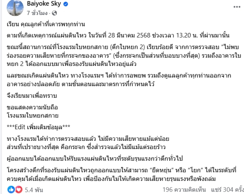เรียน คุณลูกค้าที่เคารพทุกท่านตามที่เกิดเหตุการณ์แผ่นดินไหว ในวันที่ 28 มีนาคม 2568 ช่วงเวลา 13.20 น. ที่ผ่านมานั้นขณะนี้สถานการณ์ที่โรงแรมใบหยกสกาย (ตึกใบหยก 2) เรียบร้อยดี จากการตรวจสอบ ไม่พบร่องรอยความเสียหายที่กระจกของอาคาร (ซึ่งกระจกเป็นส่วนที่บอบบางที่สุด) รวมถึงอาคารใบหยก 2 ได้ออกแบบมาเพื่อรองรับแผ่นดินไหวอยู่แล้วและขณะเกิดแผ่นดินไหว