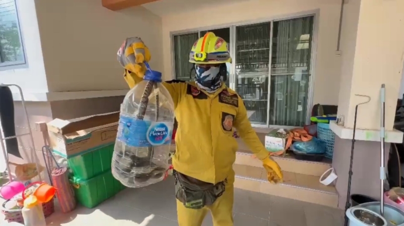 เจ้าของบ้าน เล่าว่า หลังจากตื่นนอนมาตอนเช้ากำลังเข้าครัวเตรียมอาหารเห็นงูตัวสีดำในครัว จึงวิ่งหนีออกมาหน้าบ้าน มาเจอตัวตัวที่ 2 ที่หน้าบ้าน ต่อมาจึงแจ้งกู้ภัยให้มาช่วยจับ