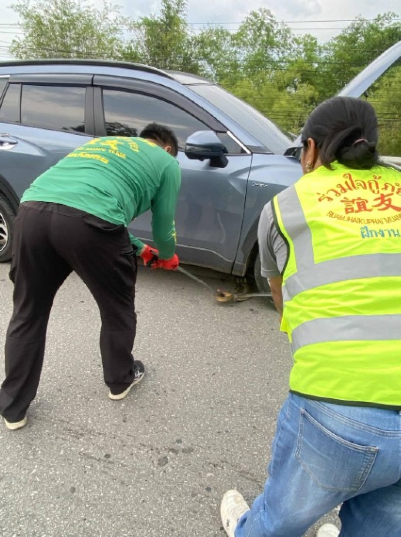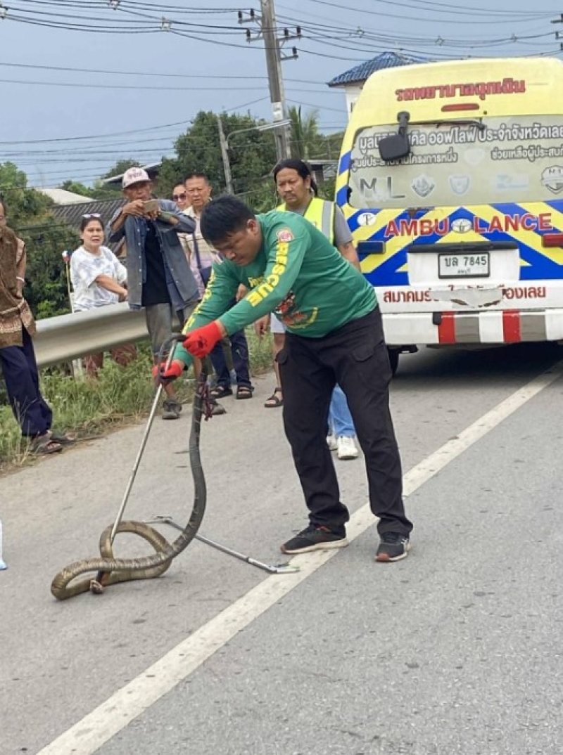 เมื่อไปถึงพบว่ารถ จยย.หักหลบงูจงอางที่เลื้อยอยู่บนถนน โดนรถเก๋งที่ขับตามมาเฉี่ยวชนจนล้มแล้วหลบหนีไป จนรถเก๋งโตโยต้าครอส สีเทา หมายเลขทะเบียน 1005 ขอนแก่น ที่ขับตามมาเบรกระทันหัน เพื่อไม่ให้เกิดเหตุซ้ำซ้อน ส่วนคนขับรถ จยย.บาดเจ็บ กู้ภัยฯ นำส่ง รพ.เลย