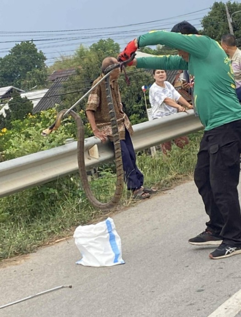 ระหว่างนั้น จู่ๆ เจ้าของรถเก๋งโตโยต้า มาบอกว่าช่วยดูรถหน่อยสงสัยงูจงอางจะเลื้อยเข้าไปในรถ จึงเปิดฝากระโปรงดู พบงูจงอางยาวกว่า 3 เมตร นอนคดอยู่ห้องเครื่อง ต้องใช้เวลาจับนาน 20 นาที นำไปปล่อยป่าคืนสู่ธรรมชาติ และนำว่าเป็นความโชคดีที่ผู้บาดเจ็บไม่ถูกงูจงอางฉกและกัด ปลอดภัยทั้งคนและงู