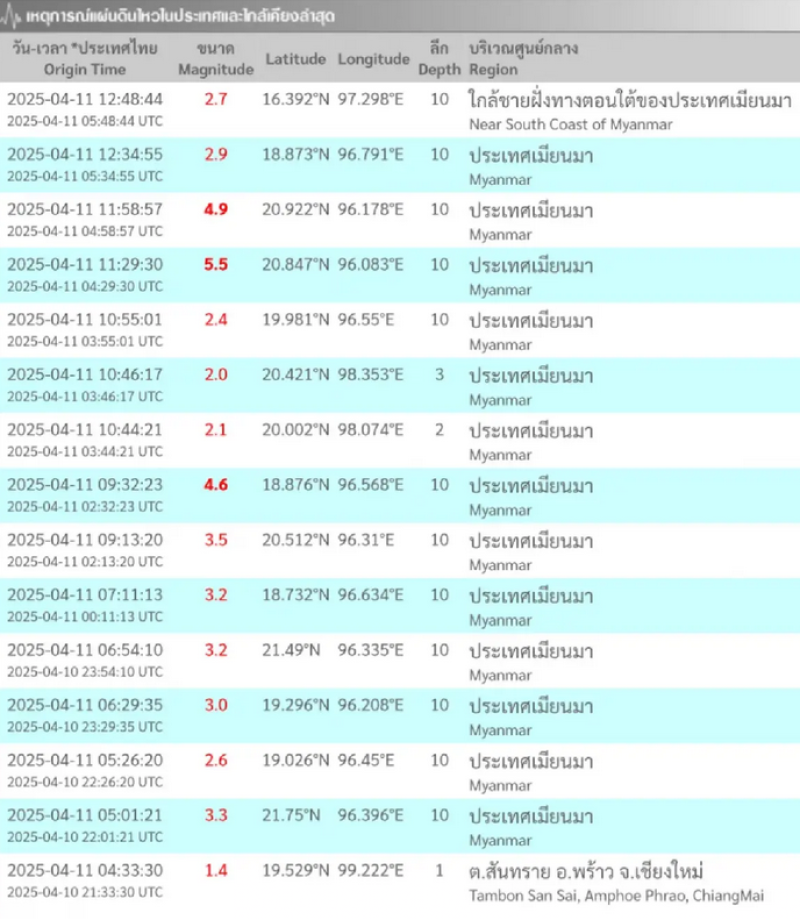 วันที่ 11 เมษายน 2568 กองเฝ้าระวังแผ่นดินไหว กรมอุตุนิยมวิทยารายงานเหตุแผ่นดินไหวในประเทศเมียนมา เมื่อเวลา 11.29 น. ตามเวลาประเทศไทย จุดศูนย์กลางอยู่ที่ละติจูด 20.847°N ลองจิจูด 96.083°E ความลึกจากผิวดิน 10 กิโลเมตร วัดแรงสั่นสะเทือนได้ที่ขนาด 5.5 ตามมาตราริกเตอร์