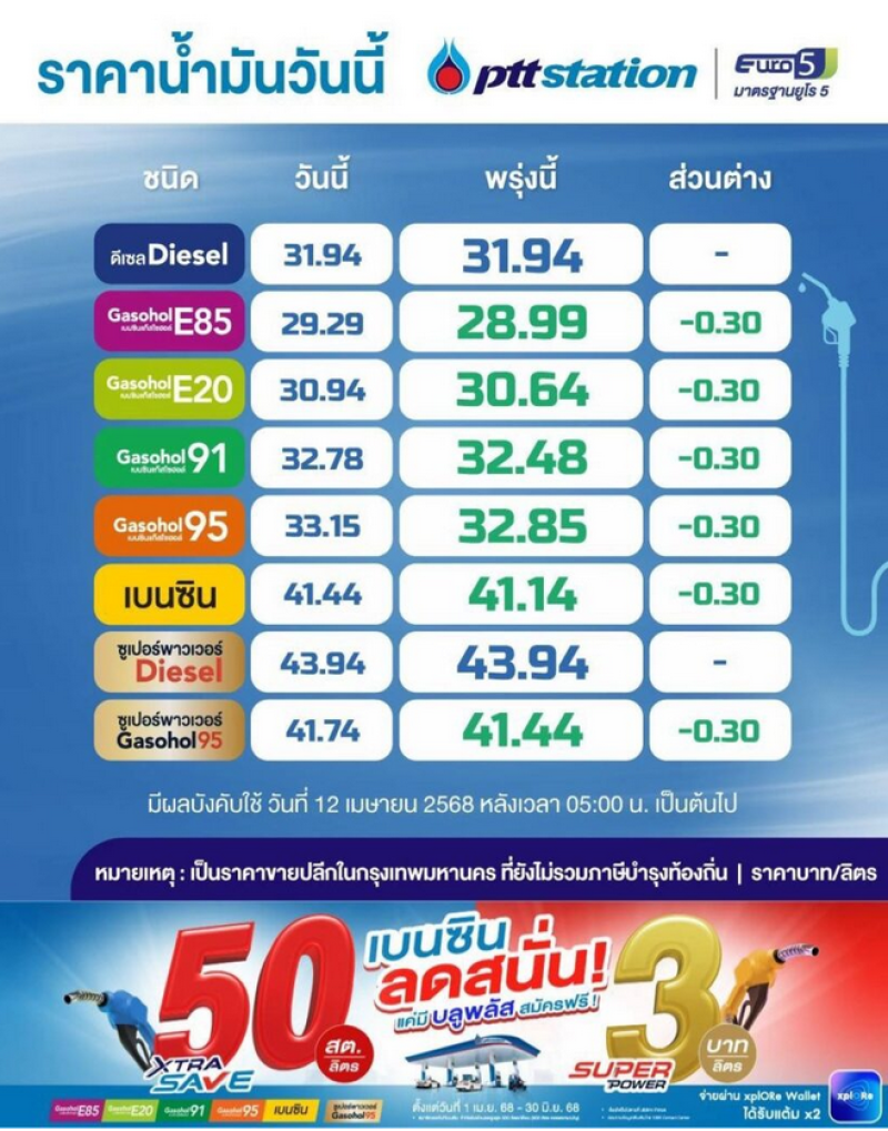 PTT Station ปรับราคาขายปลีกน้ำมันเบนซินและกลุ่มแก๊สโซฮอล์ ลดลง 0.30 บาท/ลิตร สำหรับกลุ่มดีเซลคงเดิม มีผล 12 เม.ย. 2568 เวลา 05.00 น.เป็นต้นไป