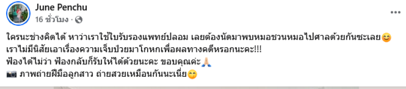 ล่าสุด จูน เพ็ญชุลี โดนกล่าวหาจนต้องออกมาชี้แจงอีกแล้ว หลังโดนกล่าวหาว่าปลอมใบรับรองแพทย์ในคดีทีจูน เพ็ญชุลี สู้คดีกับมือที่สาม โดย จูน เพ็ญชุลี ได้ออกมาโพสต์ชี้แจงผ่านทางเฟซบุ๊ค June Penchu ระบุว่า ใครนะช่างคิดได้ หาว่าเราใช้ใบรับรองแพทย์ปลอม เลยต้องนัดมาพบหมอชวนหมอไปศาลด้วยกันซะเลย