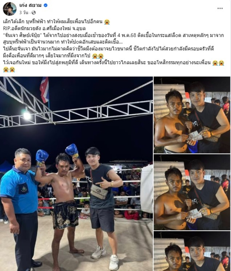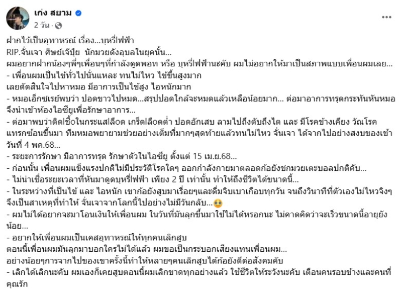 ต่อมา เก่ง ได้โพสต์อีกว่า ฝากไว้เป็นอุทาหรณ์ เรื่อง…บุหรี่lฟฟ้า RIP.จั่นเจา ศิษย์เจ๊ปุ๋ย นักมวยดังอุบลในยุคนั้น… ผมอยากฝากน้องๆพี่ๆเพื่อนๆที่กำลังดูดพอท หรือ บุหรี่lฟฟ้านะคับ ผมไม่อยากให้มาเป็นสภาพแบบเพื่อนผมเลย…