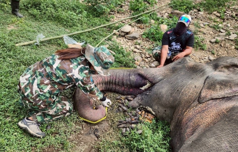 ความจริงอันน่าตกใจปรากฏขึ้นภายหลังการผ่าชันสูตรซาก โดยทีมสัตวแพทย์พบร่องรอยบาดแผลคล้ายถูกยิงด้วยกระสุนปืนถึง 5 จุด กระจายอยู่ทั่วร่างกาย ทั้งบริเวณงวง โคนงา ช่องท้อง และขาหลังด้านซ้าย เมื่อใช้เครื่องสแกนโลหะก็พบสัญญาณโลหะภายในซากช้าง การผ่าเปิดบาดแผลที่ขาหลังซึ่งบวมเป่ง พบหนองขนาดใหญ่ถึง 40 เซนติเมตร ทำให้กระดูกข้อต่อหลุดออกจากกัน เนื้อเยื่อและเส้นเอ็นเน่าเสียหาย นอกจากนี้ ยังพบหัวกระสุนและเศษโลหะรวม 5 ชิ้นฝังอยู่ในตัวช้าง โดยเฉพาะกระสุนขนาด .22 ที่พบใกล้โคนงา