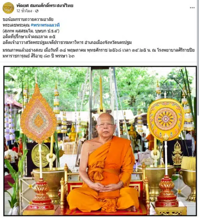 คณะสงฆ์และพุทธศาสนิกชนร่วมไว้อาลัย ‘พระพรหมเวที’ (สุเทพ ผุสฺสธมฺโม ป.ธ.9) อดีตเจ้าอาวาสวัดพระปฐมเจดีย์ราชวรมหาวิหาร จังหวัดนครปฐม และอดีตที่ปรึกษาเจ้าคณะภาค 15 ถึงแก่มรณภาพลงอย่างสงบ เมื่อเวลา 19.25 น. ของวันที่ 14 พฤษภาคม 2568 ณ โรงพยาบาลศิริราชปิยมหาการุณย์ สิริอายุได้ 84 ปี นับพรรษาได้ 63 พรรษา