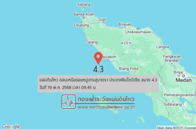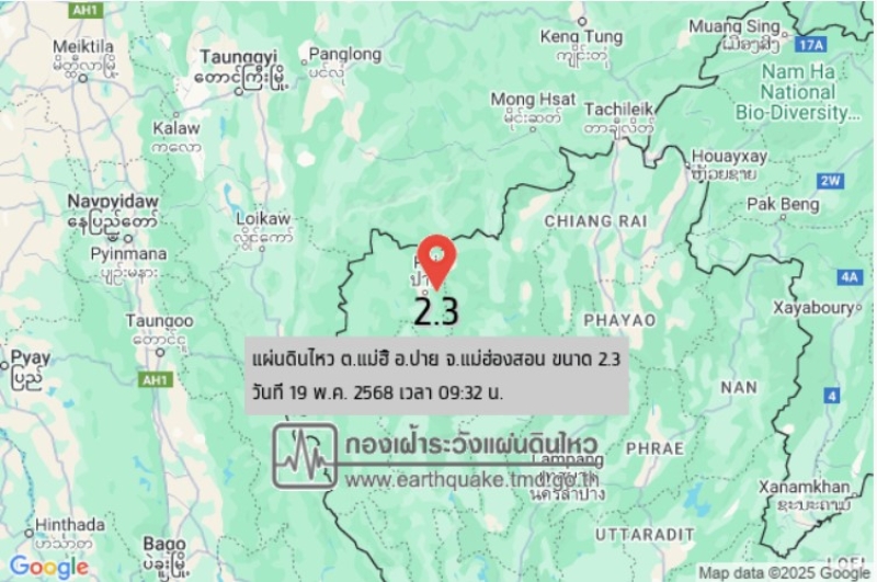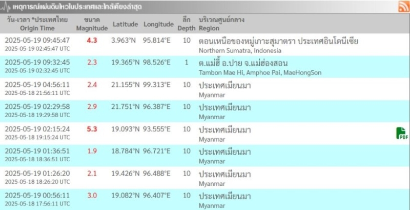 เมื่อวันที่ 19 พฤษภาคม 68 กองเฝ้าระวังแผ่นดินไหว กรมอุตุนิยมวิทยา แจ้งเหตุแผ่นดินไหว โดยหลังเที่ยงคืนเป็นต้นมา (ตามเวลาไทย) เกิดเหตุแผ่นดินไหวทั้งหมด 8 ครั้ง โดยครั้งที่ 1-6 เกิดขึ้นที่ประเทศเมียนมา หนักสุดครั้งที่ 4 เวลา 02:15:24 น. ตามเวลาไทย ขนาด 5.3 ลึก 10 กิโลเมตร ทางทิศตะวันตกเฉียงเหนือของ อ.ขุนยวม จ.แม่ฮ่องสอน ประมาณ 462 กม.