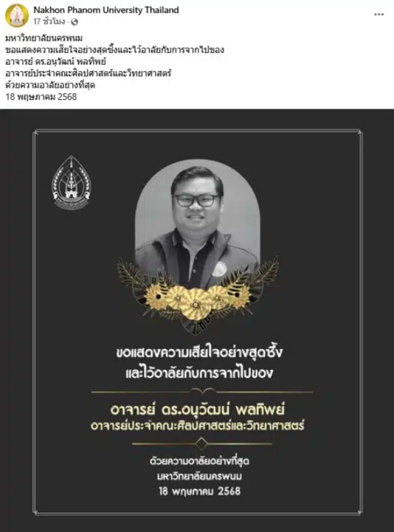 เฟซบุ๊กของ Nakhon Phanom University Thailand มีการโพสต์ข้อความแสดงความไว้อาลัย ระบุว่า “มหาวิทยาลัยนครพนม ขอแสดงความเสียใจอย่างสุดซึ้งและไว้อาลัยกับการจากไปของ อาจารย์ ดร.อนุวัฒน์ พลทิพย์ อาจารย์ประจำคณะศิลปศาสตร์และวิทยาศาสตร์ ด้วยความอาลัยอย่างที่สุด 18 พฤษภาคม 2568″