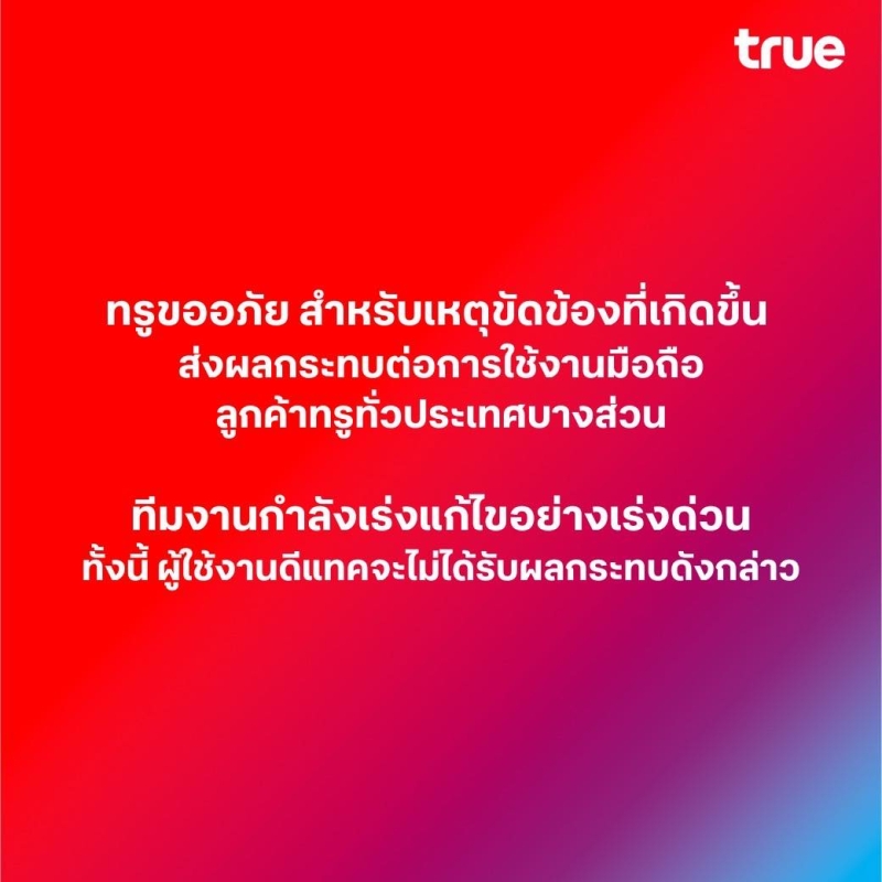 ล่าสุด ทรูขออภัย สำหรับเหตุขัดข้องที่เกิดขึ้น กำลังเร่งแก้ไขอย่างเร่งด่วน