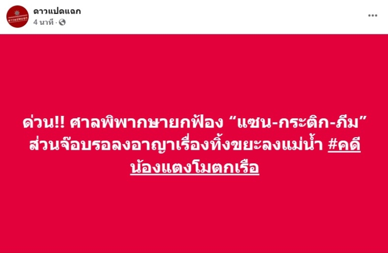 ล่าสุด ทางเพจดัง ดาวแปดแฉก มีการรายงานแล้วว่า ศาลพิพากษายกฟ้อง แซน-กระติก-ภีม ส่วนจ๊อบรอลงอาญาเรื่องทิ้งขยะลงแม่น้ำ
