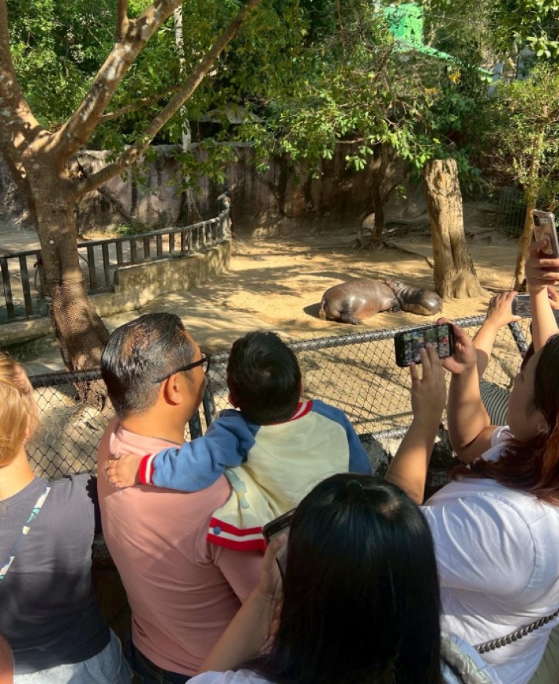 คือหมูเด้งคิวแน่นมาก แต่เราก็คือขอรบกวนนักท่องเที่ยวคนอื่นลัดคิวสักนิดนึง และให้น้องได้ดูแบบเต็มที่ ซึ่งหมูเด้งเวลานี้ต้องลงน้ำนอนเเล้ว แต่วันนั้นหมูเด้งก็นอนตรงนี้นานมากจนน้องกลับเลย และเราก็พาน้องไปเลือกของที่ระลึก ซึ่งอย่างที่รู้น้องชอบหมูเด้งมาก น้องก็เลยเลือกคาปิบาร่ากลับไป พวกเรายินดีมากๆที่เป็นส่วนหนึ่งในการสร้างความสุขให้น้อง