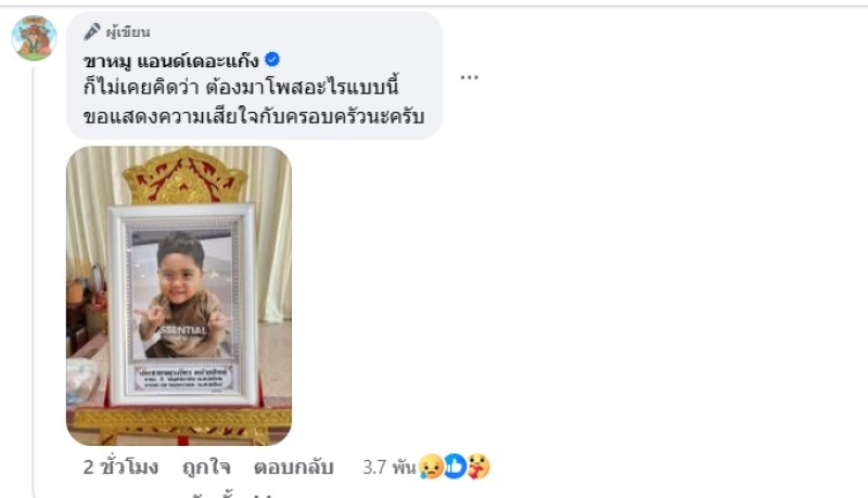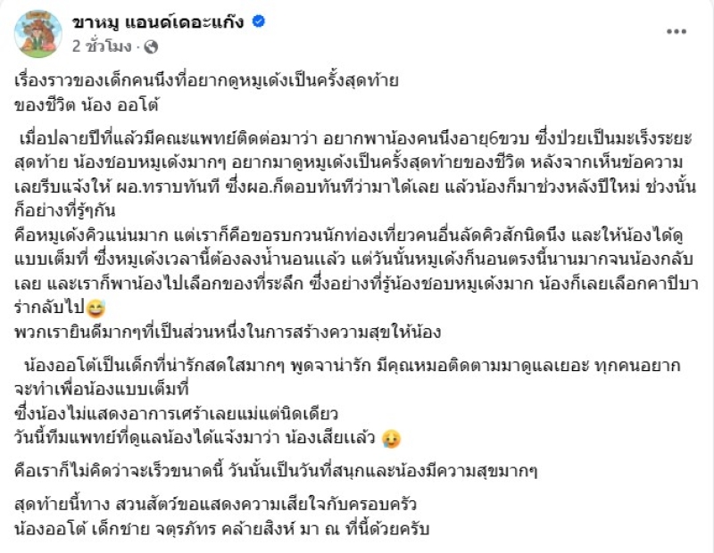 เรียกได้ว่า ทำเอาหลายๆคนต่างเศร้าไปตามๆกัน เมื่อทางเพจ ขาหมู แอนด์เดอะแก๊ง ได้ออกมาโพสต์เรื่องเศร้า ว่า เรื่องราวของเด็กคนนึงที่อยากดูหมูเด้งเป็นครั้งสุดท้าย ของชีวิต น้อง ออโต้