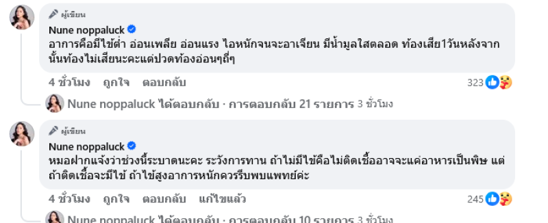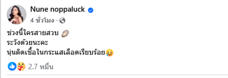 เป็นอีกหนึ่งอินฟลูเอนเซอร์สายบิวตี้ชื่อดังสำหรับ นุ่น นพลักษณ์ ที่ล่าสุดเมื่อวันที่ 5 มิ.ย. 68 ได้ออกมาโพสต์เตือนแฟนๆหลังรับประทานหอยนางรมและหอยแครงดิบ จนเกิดอาการติดเชื้อในกระแสเลือด ผ่านทางเฟซบุ๊ค Nune noppaluck ระบุว่า ช่วงนี้ใครสายสวบระวังด้วยนะคะ นุ่นติดเชื้อในกระแสเลือดเรียบร้อย