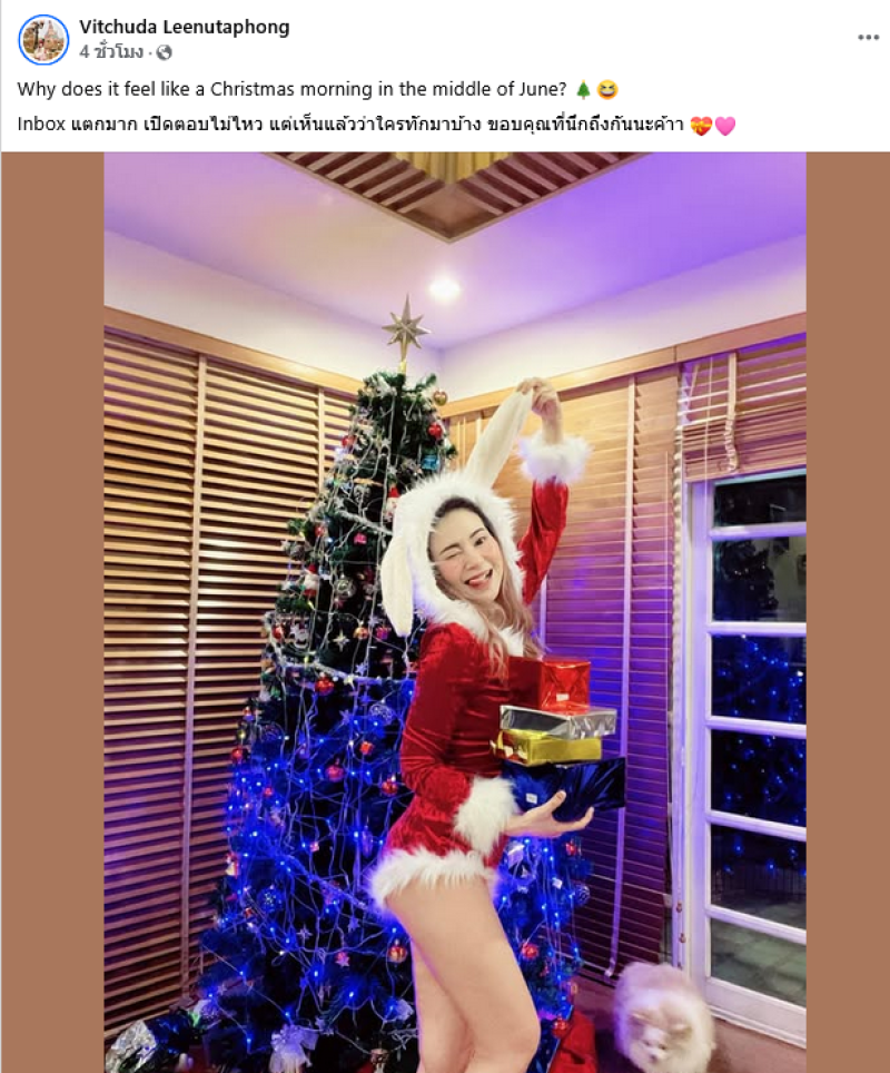ด้าน ไฮโซตั๋ม วิชชุดา ลีนุตพงษ์ อดีตคู่กรณีของ หมอแอร์ โพสต์ข้อความผ่านทางเฟซบุ๊ก ระบุว่า Why does it feel like a Christmas morning in the middle of June? (ทำไมรู้สึกเหมือนเป็นเช้าวันคริสมาสต์ในกลางเดือนมิถุนายน) Inbox แตกมาก เปิดตอบไม่ไหว แต่เห็นแล้วว่าใครทักมาบ้าง ขอบคุณที่นึกถึงกันนะค้า