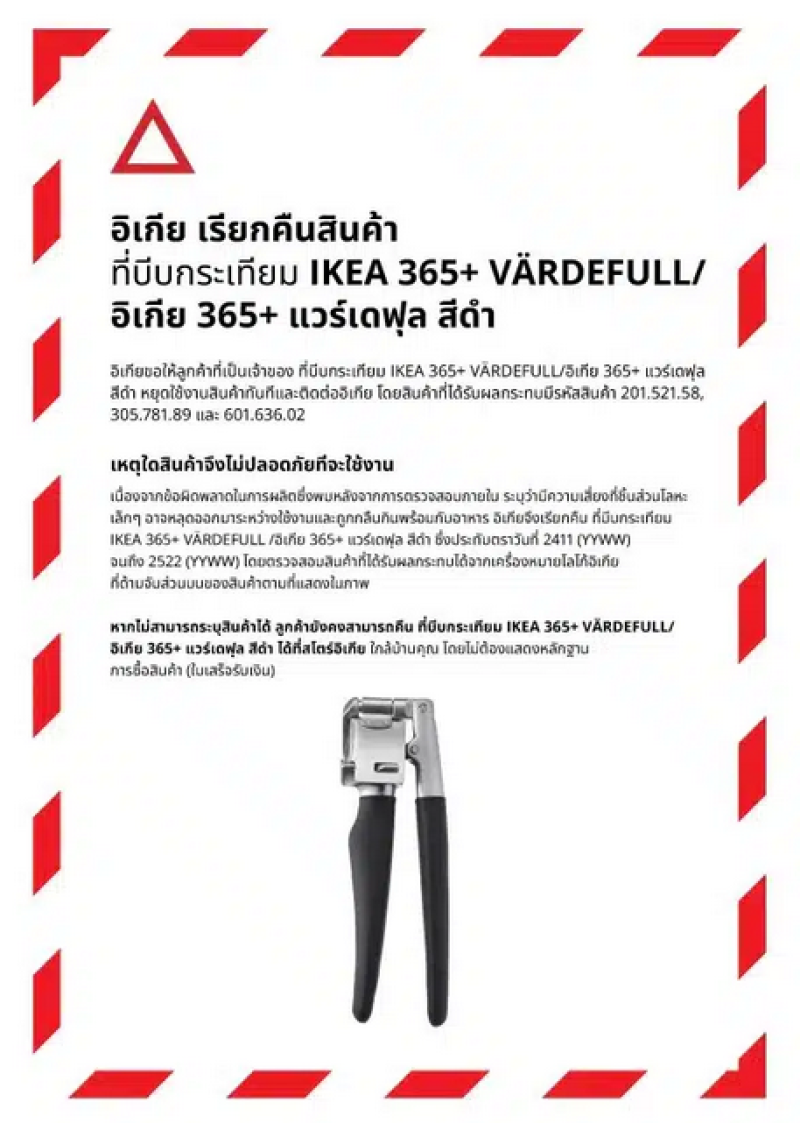 วันนี้ (11 มิ.ย.) เพจ IKEA โพสต์ประกาศว่า ขอความร่วมมือลูกค้าที่เป็นเจ้าของ ที่บีบกระเทียม IKEA 365+ VÄRDEFULL/อิเกีย 365+ แวร์เดฟุล สีดำ ให้หยุดใช้สินค้าทันทีและติดต่อทางอิเกียทันที เนื่องจากมีข้อผิดพลาดในการผลิต ทำให้มีความเสี่ยงที่ชิ้นส่วนโลหะเล็ก ๆ อาจหลุดออกมาระหว่างใช้งานใช้งานและถูกกลืนกินไปพร้อมกับอาหารได้