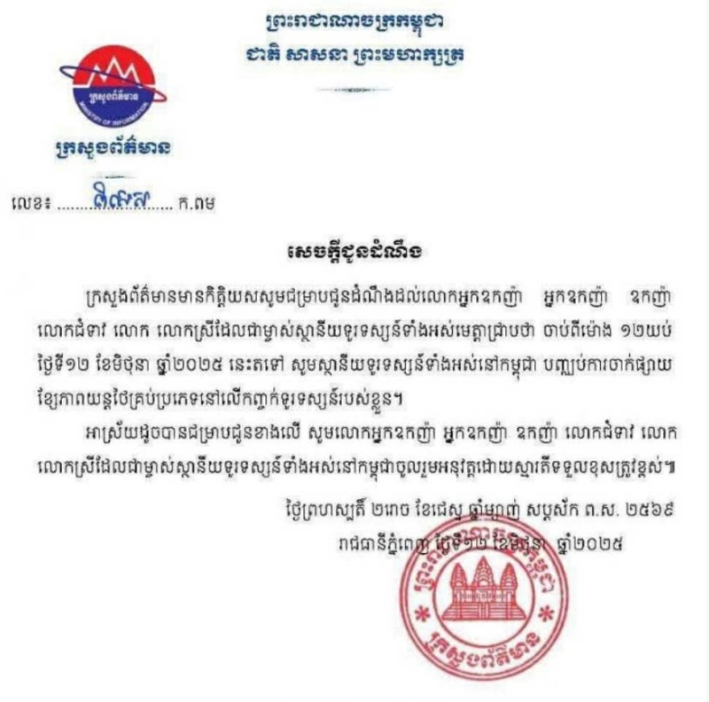 เรียกได้ว่าเป็นคำสั่งฟ้าผ่า เมื่อ กระทรวงข่าวสารกัมพูชา ออกประกาศให้สถานีโทรทัศน์ทุกช่องในประเทศ ยุติการออกอากาศผลงานบันเทิงจากไทย ทั้งละคร ภาพยนตร์ และเพลงไทยทุกประเภท มีผลตั้งแต่วันที่ 13 มิถุนายน 2568 เป็นต้นไป