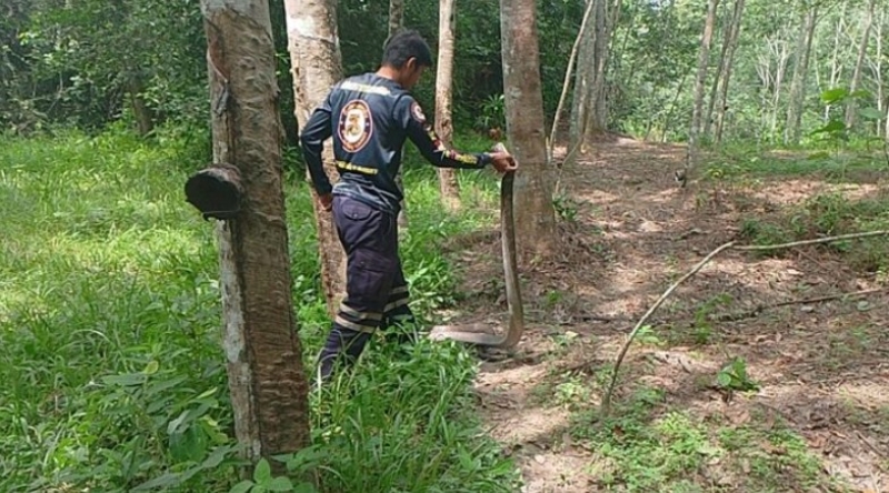 วันที่ 16 มิ.ย.2568 นางติเมาะ อายุ 65 ปี อยู่บ้านเลขที่ 29 ม.7 บ้านสม็อง ต.ปลักหนู อ.นาทวี จ.สงขลา รับแจ้งจากลูกจ้างที่กรีดยางอยู่ในสวนยาง พบงูจงอางตัวใหญ่กำลังกินงูสิงอยู่ที่โคนต้นยางพารา ลูกจ้างผวากลัวไม่กล้าเข้าไปกรีดยาง จึงรีบประสานไปยังทีมอสรพิษวิทยาภาคใต้ และ ทีมปราบอสรพิษอาสาพิทักษ์งู จ.สงขลา ให้ช่วยมาจับงูจงอางให้ด้วย