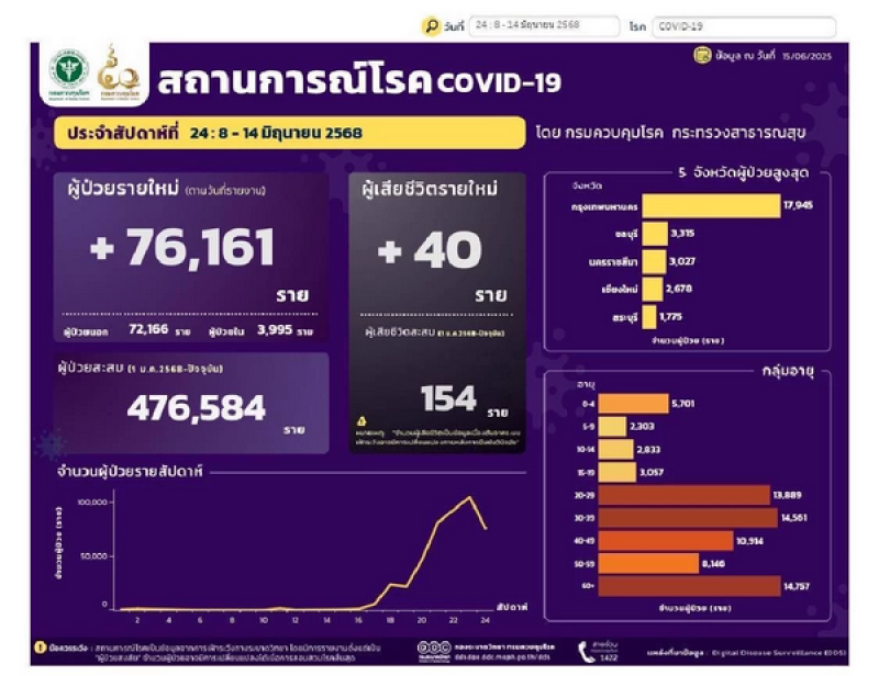 กรมควบคุมโรค กระทรวงสาธารณสุข รายงานสถานการณ์โรคโควิด-19 ประจำสัปดาห์ที่ 24 (ระหว่างวันที่ 8–14 มิถุนายน 2568) พบผู้ป่วยรายใหม่จำนวน 76,161 ราย แบ่งเป็นผู้ป่วยนอก 72,166 ราย และผู้ป่วยใน 3,995 ราย ส่งผลให้ยอดผู้ป่วยสะสมตั้งแต่ต้นปี (1 ม.ค. 2568) จนถึงปัจจุบันอยู่ที่ 476,584 ราย
