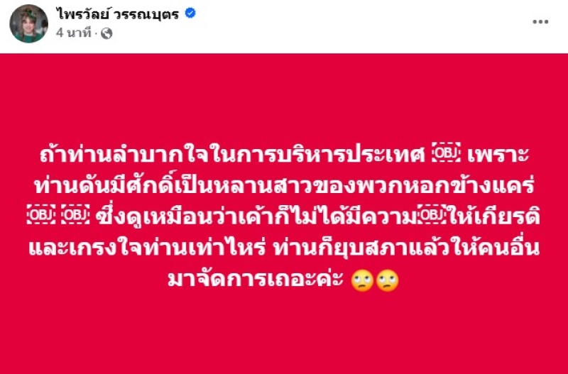 และอีกโพสต์ ถ้าท่านลำบากใจในการบริหารประเทศ เพราะท่านดันมีศักดิ์เป็นหลานสาวของพวกหอกข้างแคร่ ซึ่งดูเหมือนว่าเค้าก็ไม่ได้มีความ ให้เกียรติและเกรงใจท่านเท่าไหร่ ท่านก็ยุบสภาแล้วให้คนอื่นมาจัดการเถอะค่ะ