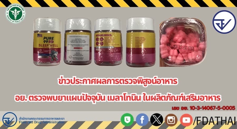 สำนักงานคณะกรรมการอาหารและยา (อย.) ประกาศผลการตรวจพิสูจน์อาหาร อย. ตรวจพบยาแผนปัจจุบัน เมลาโทนิน ในผลิตภัณฑ์เสริมอาหาร “คาโมมายล์ กัมมี่ พลัส (ตรา เพียว ๙๙) เลข อย. ๑๐-๓-๑๔๐๖๗-๕-๐๐๐๕ ระบุวันเดือนปีที่ผลิตและหมดอายุดูใต้กล่อง MFG: 12/19/2024 EXP: 12/18/2026