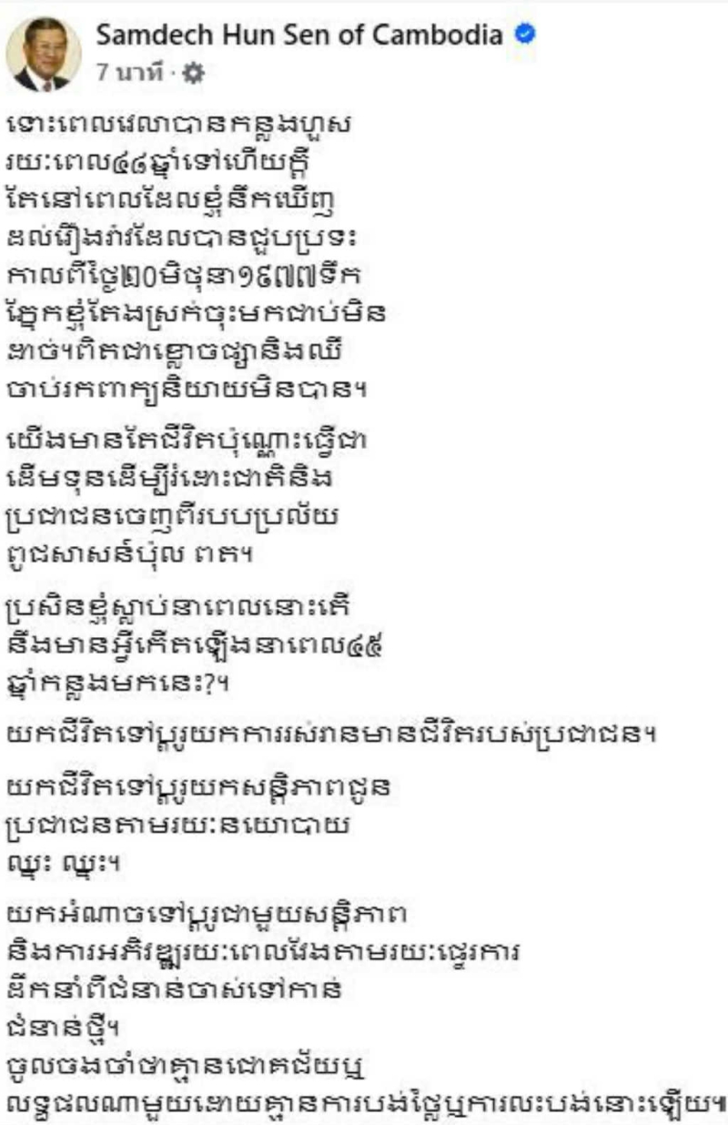 เรียกได้ว่า เป็นวันสำคัญของกัมพูชาอีกวันหนึ่ง สำหรับวันที่ 20 มิ.ย. ปีนี้ สมเด็จฮุน เซน ประธานวุฒิสภา และ อดีตนายกรัฐมนตรี โพสต์เฟซบุ๊ก samdech hun sen of cambodia รำลึกครบรอบ 48 ปี วันเริ่มต้นล้มเขมรแดง เมื่อ ปี 2520