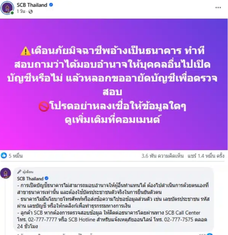 จากกรณี เพจเฟซบุ๊ก SCB Thailand ระบุว่า เตือนภัยมิจฉาชีพอ้างเป็นธนาคาร ทำทีสอบถามว่าได้มอบอำนาจให้บุคคลอื่นไปเปิดบัญชีหรือไม่ แล้วหลอกขออายัดบัญชีเพื่อตรวจสอบ โปรดอย่าหลงเชื่อให้ข้อมูลใดๆ