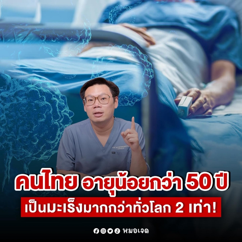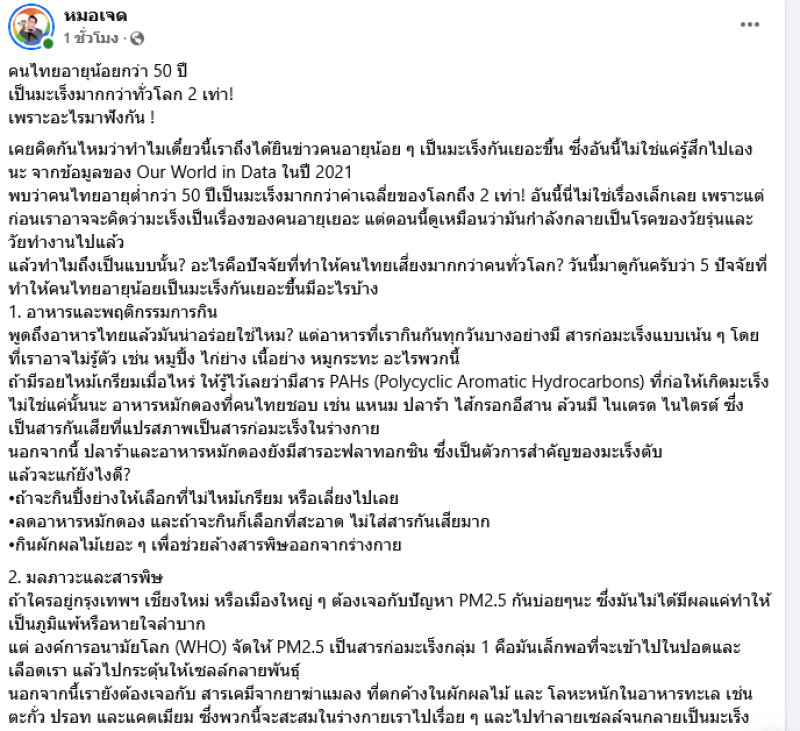 ล่าสุดรองผู้อำนวยการโรงพยาบาลมหาราช นครราชสีมา หมอเจด นพ.เจษฎ์ บุณยวงศ์วิโรจน์ ได้ออกมาโพสต์ข้อความผ่านทางเฟซบุ๊ค หมอเจด ระบุว่า เคยคิดกันไหมว่าทำไมเดี๋ยวนี้เราถึงได้ยินข่าวคนอายุน้อยๆ เป็นมะเร็งกันเยอะขึ้น ซึ่งอันนี้ไม่ใช่แค่รู้สึกไปเองนะ จากข้อมูลของ Our World in Data ในปี 2021 พบว่าคนไทยอายุต่ำกว่า 50 ปีเป็นมะเร็งมากกว่าค่าเฉลี่ยของโลกถึง 2 เท่า