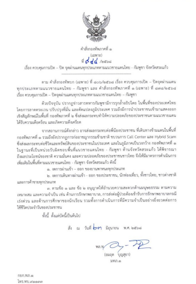 วันที่ 23 มิ.ย.2568 พล.ท.อมฤต บุญสุยา มทภ.1 ลงนามในคำสั่งกองทัพภาคที่ 1 (เฉพาะ) ที่ 944 /568 เรื่อง ควบคุมการเปิด – ปิด จุดผ่านแดนทุกประเภทตามแนวชายแดนไทย – กัมพูชา จังหวัดสระแก้ว ตาม คำสั่งกองทัพบก (เฉพาะ) ที่ 806/2568 เรื่อง ควบคุมการเปิด – ปิดจุดผ่านแดน ทุกประเภทตามแนวชายแดนไทย – กัมพูชา และ คำสังกองทัพภาคที่๑ (เฉพาะ) ที่878/2568เรื่อง ควบคุมการเปิด – ปิดจุดผ่านแดนทุกประเภทตามแนวชายแดนไทย – กัมพูชา