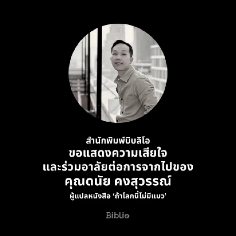 วันที่ 23 มิถุนายน 2568 เพจเฟซบุ๊ก Biblio ได้แจ้งข่าวการจากไปของ "ดนัย คงสุวรรณ์" นักแปลอิสระชื่อดัง เจ้าของผลงานแปลระดับมาสเตอร์พีซอย่าง ถ้าโลกนี้ไม่มีแมว สร้างความโศกเศร้าและอาลัยให้กับแฟนนักอ่านจำนวนมาก