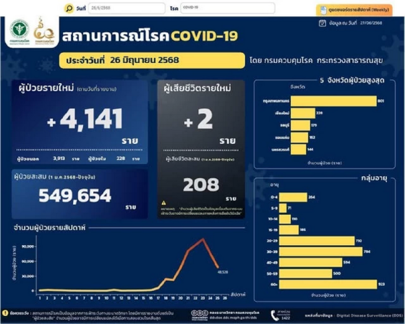 กรมควบคุมโรค กระทรวงสาธารณสุข รายงานสถานการณ์โรคโควิด-19 ประจำวันที่ 26 มิถุนายน 2568 พบผู้ป่วยรายใหม่จำนวน 4,141 ราย แบ่งเป็น