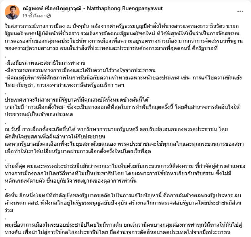 หลังจากศาลรัฐธรรมนูญมีคำสั่งให้นางสาวแพทองธาร ชินวัตร นายกรัฐมนตรี หยุดปฏิบัติหน้าที่ชั่วคราว ล่าสุดหัวหน้าพรรคประชาชน เท้ง ณัฐพงษ์ เรืองปัญญาวุฒิ ได้ออกมาเคลื่อนไหวผ่านเฟซบุ๊คณัฐพงษ์ เรืองปัญญาวุฒิ - Natthaphong Ruengpanyawut ระบุว่า