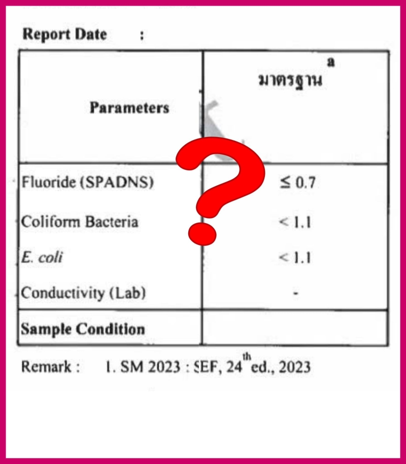 ค่าที่สอง คือ Coliform Bacteria (โคลิฟอร์มแบคทีเรีย) บ่งชี้ว่า น้ำอาจปนเปื้อนสิ่งสกปรก เช่น น้ำเสีย หรือ อุจจาระ มาตรฐานที่ปลอดภัย ต้องน้อยกว่า 1.1 MPN/100 มิลลิลิตร