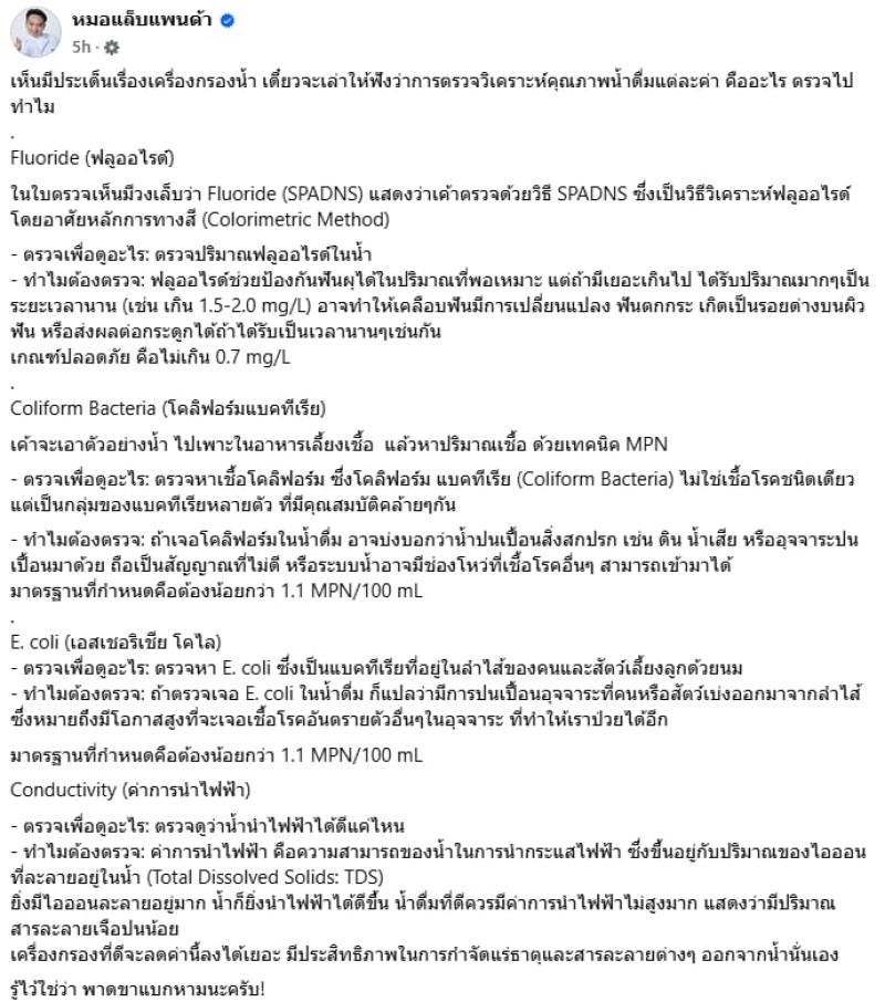 เรียกได้ว่า หลายคนยังไม่ทราบ เกี่ยวกับค่าที่ใช้วิเคราะห์น้ำดื่มในเครื่องกรองน้ำ ล่าสุด ทนพ.ภาคภูมิ เดชหัสดิน นักเทคนิคการแพทย์ ได้โพสต์ให้ความรู้ผ่านเพจ หมอแล็บแพนด้า