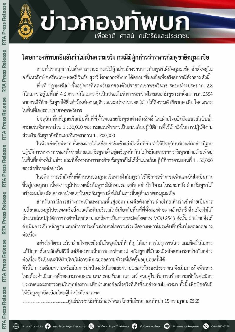 พลตรี วินธัย สุวารี โฆษกกองทัพบก ได้ออกมายืนยันแล้ว ไม่เป็นความจริง กรณีมีผู้กล่าวอ้างว่าทหารกัมพูชาได้ยึดภูมะเขือ ซึ่งตั้งอยู่ใน อ.กันทรลักษ์ จ.ศรีสะเกษ พร้อมทั้งมีการชี้แจงข้อเท็จจริงเกี่ยวกับกรณีดังกล่าว ผ่าน ทีมโฆษกกองทัพบก ดังนี้