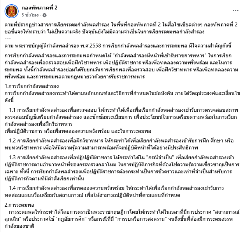 จากกรณีที่ก่อนหน้านี้ได้มีข่าวลือว่ามีการเรียกระดมพลกำลังสำรองว่อนโซเชียล ล่าสุดทางด้าน กองทัพภาคที่ 2 ได้ออกมาชี้แจง ผ่านเพจ กองทัพภาคที่ 2 แล้วว่า ตามที่ปรากฏข่าวสารการเรียกระดมกำลังพลสำรอง ในพื้นที่กองทัพภาคที่ 2 ในสื่อโซเชียลต่างๆ กองทัพภาคที่ 2 ขอชี้แจงให้ทราบว่า ไม่เป็นความจริง ปัจจุบันยังไม่มีความจำเป็นในการเรียกระดมพลกำลังสำรอง