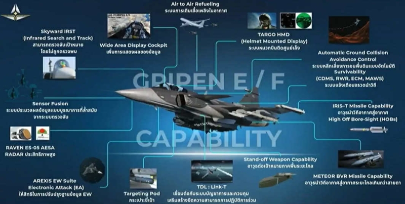 ซึ่ง กริพเพน มาพร้อมกับเทคโนโลยีที่ทันสมัย เช่น ระบบเรดาร์ AESA ที่สามารถตรวจจับ และติดตามเป้าหมายหลายตัวได้พร้อมกันจากระยะไกล และขีปนาวุธ Meteor ที่มีพิสัยยิงกว่า 150 กิโลเมตร ทำให้เครื่องบินรุ่นนี้ สามารถโจมตีเป้าหมายจากระยะไกลได้อย่างแม่นยำ และยังสามารถตอบสนองต่อภัยคุกคามได้อย่างรวดเร็ว และมีประสิทธิภาพสูง