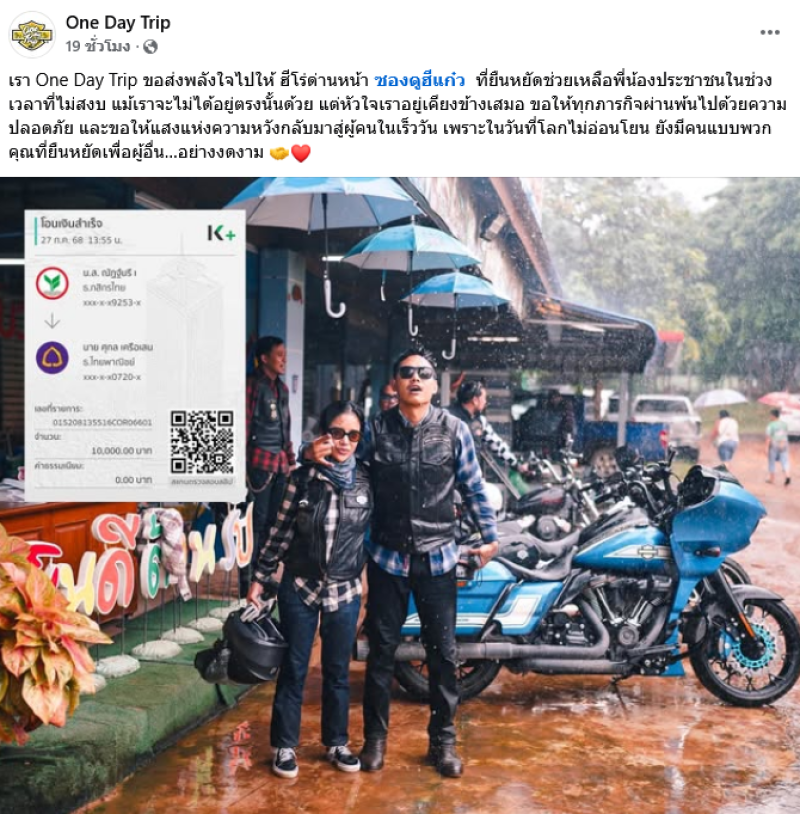 ล่าสุดของเพจ One Day Trip ซึ่งเป็นโพสต์สุดท้าย ที่บอลเพิ่งได้โอนเงินไปให้เพจดัง ซองดูฮีแก๋ว เพื่อไปช่วยพี่น้องประชาชนในช่วงเหตุการณ์ไม่สงบ โดยระบุว่า เรา One Day Trip ขอส่งพลังใจไปให้ ฮีโร่ด่านหน้า ซองดูฮีแก๋ว ที่ยืนหยัดช่วยเหลือพี่น้องประชาชนในช่วงเวลาที่ไม่สงบ แม้เราจะไม่ได้อยู่ตรงนั้นด้วย