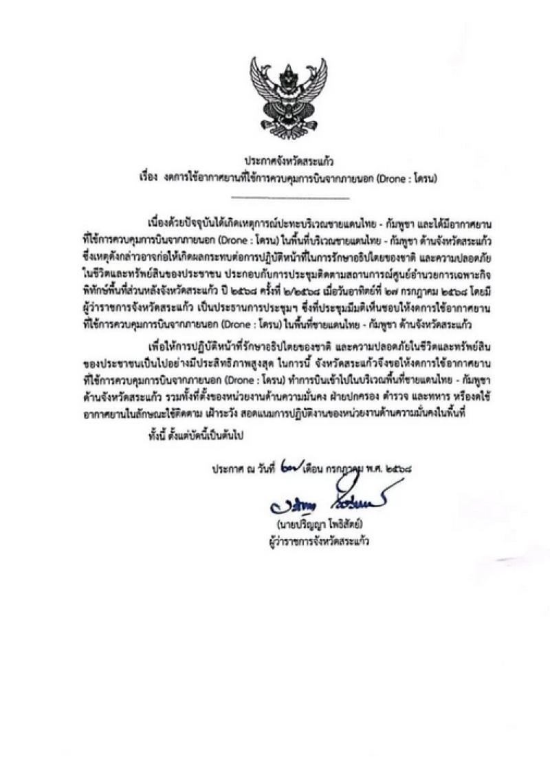 ประกอบกับการประชุมติดตามสถานการณ์ศูนย์อำนวยการเฉพาะกิจพิทักษ์พื้นที่ส่วนหลังจังหวัดสระแก้ว ปี 2568 ครั้งที่ 2/2568 เมื่อวันอาทิตย์ที่ 27 กรกฎาคม 2568 โดยมี ผู้ว่าราชการจังหวัดสระแก้ว เป็นประธานการประชุมฯ ซึ่งที่ประชุมมีมติเห็นชอบให้งดการใช้อากาศยาน ที่ใช้การควบคุมการบินจากภายนอก (Drone : โดรน) ในพื้นที่ชายแดนไทย - กัมพูชา ด้านจังหวัดสระแก้ว เพื่อให้การปฏิบัติหน้าที่รักษาอธิปไตยของชาติ และความปลอดภัยในชีวิตและทรัพย์สินของประชาชนเป็นไปอย่างมีประสิทธิภาพสูงสุด