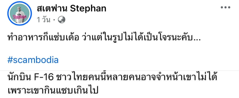 ล่าสุด สเตฟาน ถูกชาวเน็ตกัมพูชา นำภาพสมัยเจ้าตัวแสดงละคร รับบท เป็นนักบิน จากละคร รักซ่อนรส เมื่อปี 2553 มาแชร์ และบอกว่า นี่คือนักบิน F-16 สเตฟาน ไม่รอช้า รีบออกมาเคลื่อนไหวทันที พร้อมกับแชร์ภาพ และข้อความดังกล่าว ผ่านเฟซบุ๊ก สเตฟาน Stephan โดย เจ้าตัว ได้เขียนแคปชั่นว่า ทำอาหารก็แซ่บเด้อ ว่าแต่ในรูปไม่ได้เป็นโจรนะคับ พร้อมแท็ก #scambodia