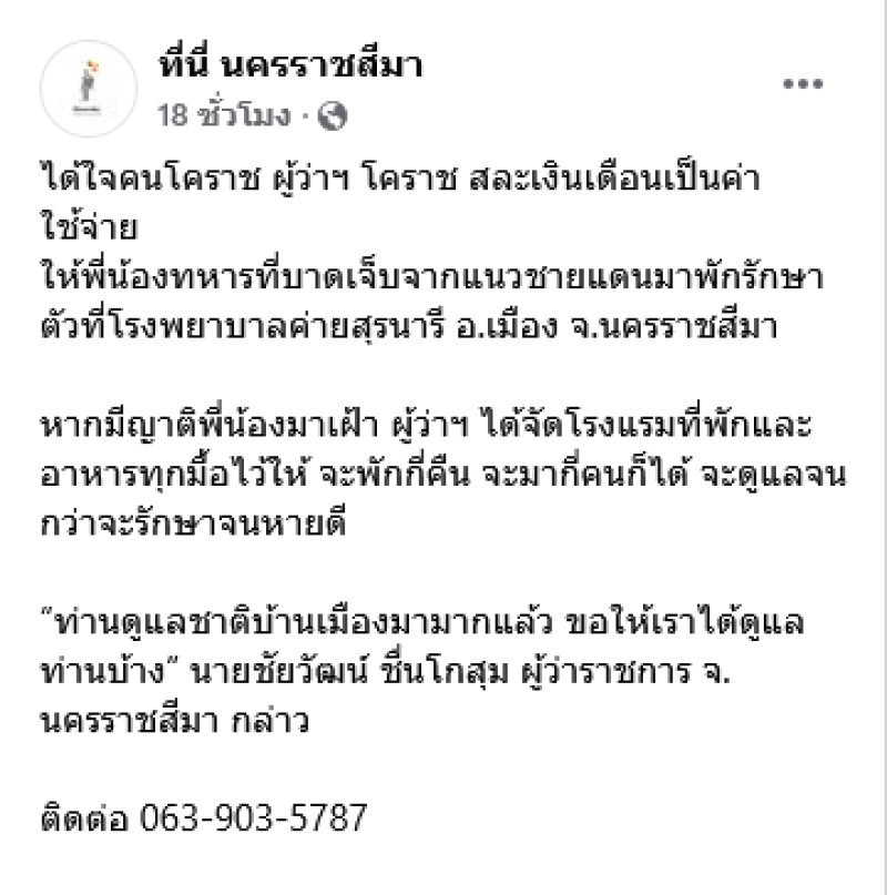 นับว่าเป็นอีกหนึ่งเรื่องราวดีๆที่หลายคนต่างชื่นชมเมื่อทางด้านเพจเฟซบุ๊คที่นี่ นครราชสีมา ได้ออกมาเปิดเผยเรื่องราวสุดประทับใจของ นายชัยวัฒน์ ชื่นโกสุม' ผู้ว่าฯ โคราช โดยระบุว่า ผู้ว่าฯ โคราช สละเงินเดือนเป็นค่าใช้จ่าย ให้พี่น้องทหารที่บาดเจ็บจากแนวชายแดนมาพักรักษาตัวที่โรงพยาบาลค่ายสุรนารี อ.เมือง จ.นครราชสีมา