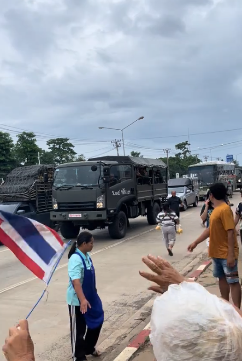 กลายเป็นภาพประทับใจในโลกออนไลน์ เมื่อผู้ใช้ TikTok @nangrong_orangejuice โพสต์คลิปวิดีโอขณะพ่อค้าแม่ค้าในพื้นที่ รวมตัวกันริมถนน โบกธงชาติไทย พร้อมส่งเสียงให้กำลังใจขบวนทหารแนวหน้าที่กำลังเดินทางผ่าน ก่อนนำของกินและเครื่องดื่มมอบให้ถึงมือ