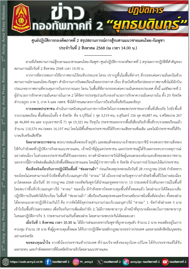 ศูนย์ปฏิบัติการกองทัพภาคที่ 2 สรุปสถานการณ์การสู้รบตามแนวชายแดนไทย-กัมพูชา ประจำวันที่ 2 สิงหาคม 2568 (ณ เวลา 14.00 น.) ตามที่เกิดสถานการณ์สู้รบตามแนวชายแดนไทย-กัมพูชา ศูนย์ปฏิบัติการกองทัพภาคที่ 2 สรุปผลการปฏิบัติที่สำคัญของสถานการณ์ถึงวันที่ 2 สิงหาคม 2568 เวลา 14.00 น.