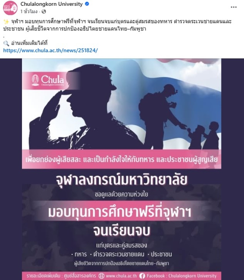 จากกรณีที่ก่อนหน้านั้น ได้มีการปะทะชายแดนไทย-กัมพูชา ทำให้หลายๆภาคส่วนส่งกำลังใจให้ทหาร และได้ออกมาให้กิจหลายๆอย่างฟรีแก่ทหารร่วมไปถึงครอบครัวของเหล่าทหานผู้กล้าด้วย ล่าสุด ทางเพจ Chulalongkorn University ของ มหาวิทยาลัยจุฬาลงกรณ์ ได้ออกมาเผยว่า