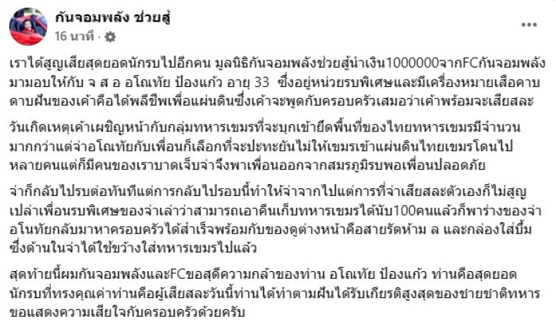 วันที่ 3 ส.ค. 68 ทางเพจ กันจอมพลัง ช่วยสู้ ได้ออกมาเผยว่า เราได้สูญเสียสุดยอดนักรบไปอีกคน มูลนิธิกันจอมพลังช่วยสู้นำเงิน1000000จากFCกันจอมพลังมามอบให้กับ จ ส อ อโณทัย ป้องแก้ว อายุ 33 ซึ่งอยู่หน่วยรบพิเศษและมีเครื่องหมายเสือคาบดาบฝันของเค้าคือได้พลีชีพเพื่อแผ่นดินซึ่งเค้าจะพูดกับครอบครัวเสมอว่าเค้าพร้อมจะเสียสละ