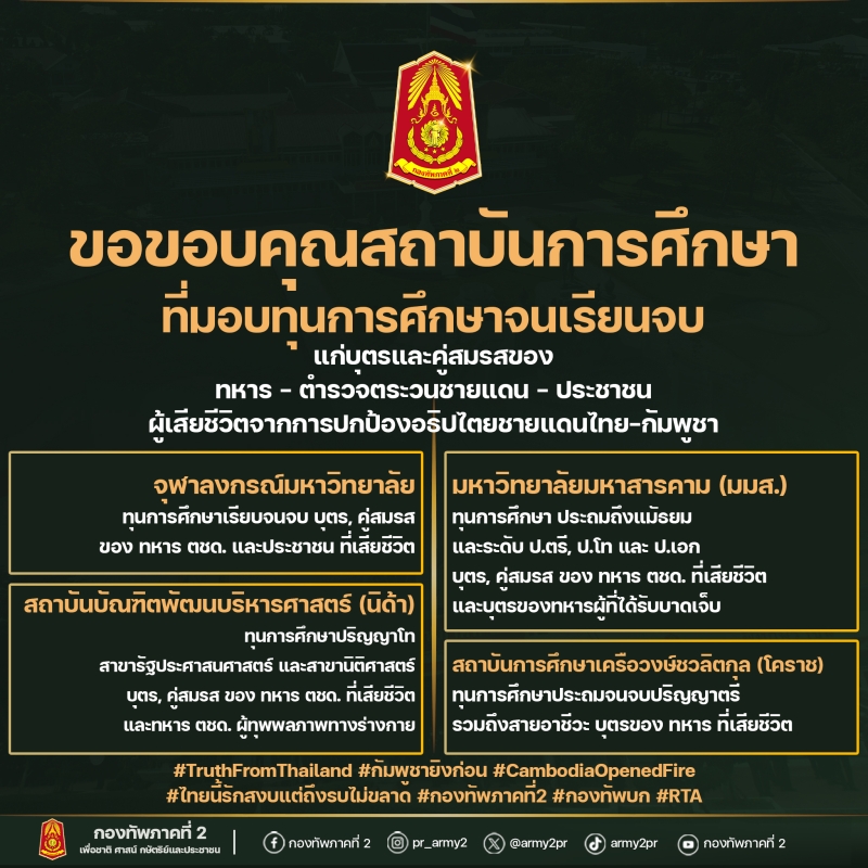 จากกรณีเหตุการณ์การปะทะชายแดนไทย-กัมพูชา ซึ่งมีเหล่าทหารกล้าของไทยได้สละชีพเพื่อปกป้องแผ่นดิน ล่าสุดทางด้านเพจ กองทัพภาคที่ 2 ได้ออกมาเผย ขอขอบคุณสถาบันการศึกษา ที่มอบทุนการศึกษาจนเรียนจบ แก่บุตรและคู่สมรสของทหาร ตำรวจตระเวนชายแดน และประชาชน ผู้เสียชีวิตจากการปกป้องอธิปไตยชายแดนไทย - กัมพูชา