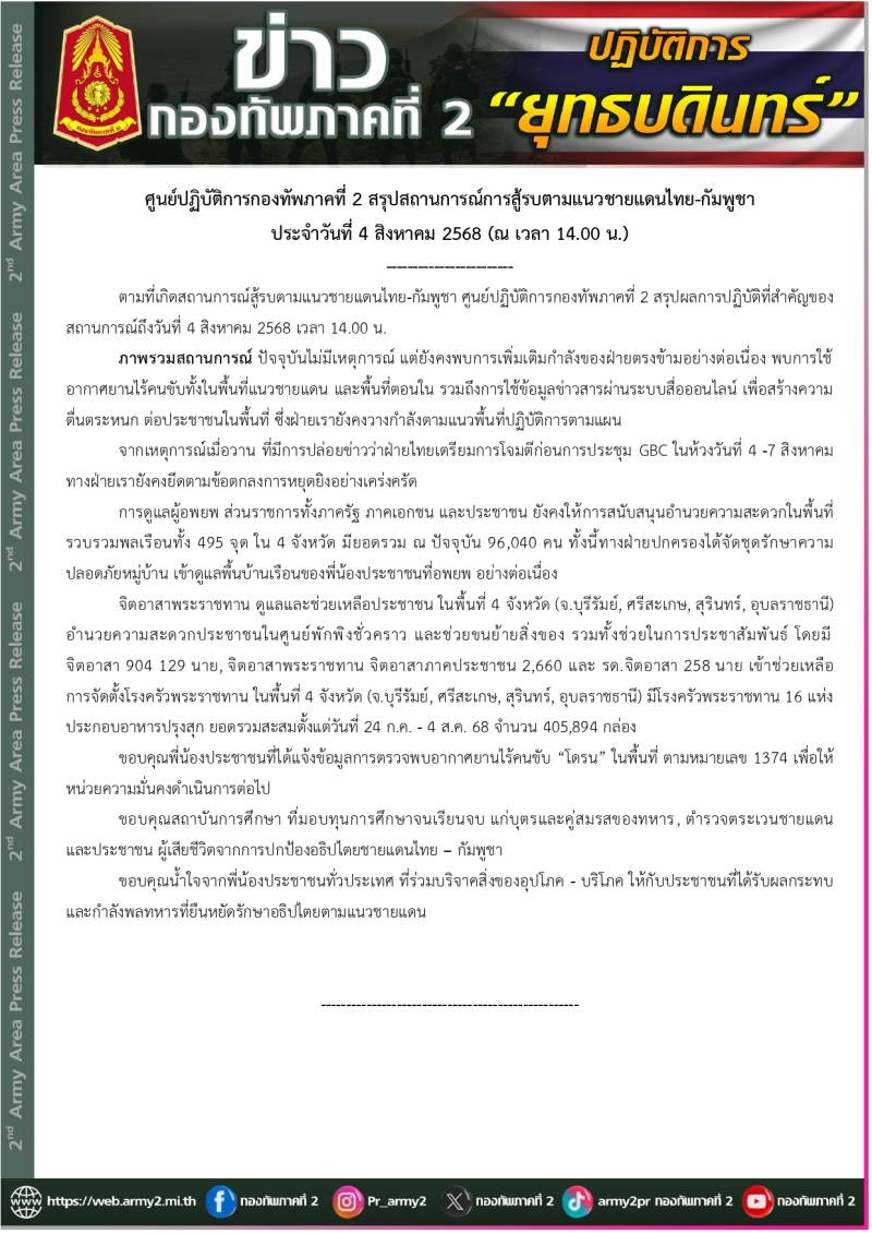 ศูนย์ปฏิบัติการกองทัพภาคที่ 2 สรุปสถานการณ์การสู้รบตามแนวชายแดนไทย-กัมพูชา ประจำวันที่ 4 สิงหาคม 2568 (ณ เวลา 14.00 น.) ตามที่เกิดสถานการณ์สู้รบตามแนวชายแดนไทย-กัมพูชา ศูนย์ปฏิบัติการกองทัพภาคที่ 2 สรุปผลการปฏิบัติที่สำคัญของสถานการณ์ถึงวันที่ 4 สิงหาคม 2568 เวลา 14.00 น.