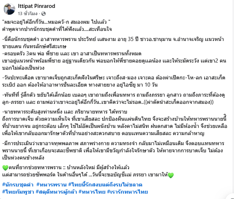 -วันปะทะเดือด เขาบาดเจ็บถูกสะเก็ดฝังในศรีษะ เจาะถึงส-มอง เจาะคอ ต้องผ่าเปิดกะ-โห-ลก เอาสะเก็ดระเบิd ออก ต้องให้อาอาหารปั่นละเอียด ทางสายยาง อยู่ไอซียู มา 10 วัน